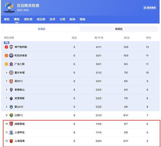 随着第6轮比赛结束,亚冠东亚区的最新积分榜也出炉了,神户胜利船继续领跑,而中超3雄依旧是3熊,排名倒数3位。上海海港贵为中超冠军,6轮比赛1胜难求,实在是羞煞先人,2平4负,只拿到2个积分,排名垫底,就这还中超冠军?他们有一点点为中国足球尊严考虑过吗?