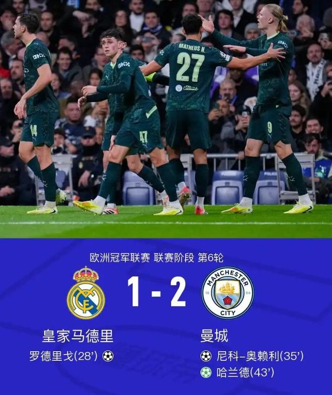 2025年12月11日 升第四!曼城2-1逆转皇马 吕迪格抱摔送点哈兰德点射罗德里戈破荒